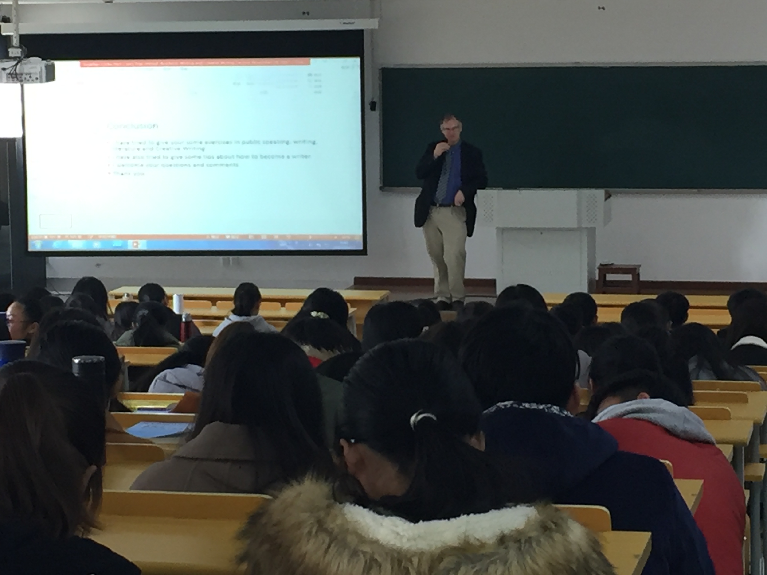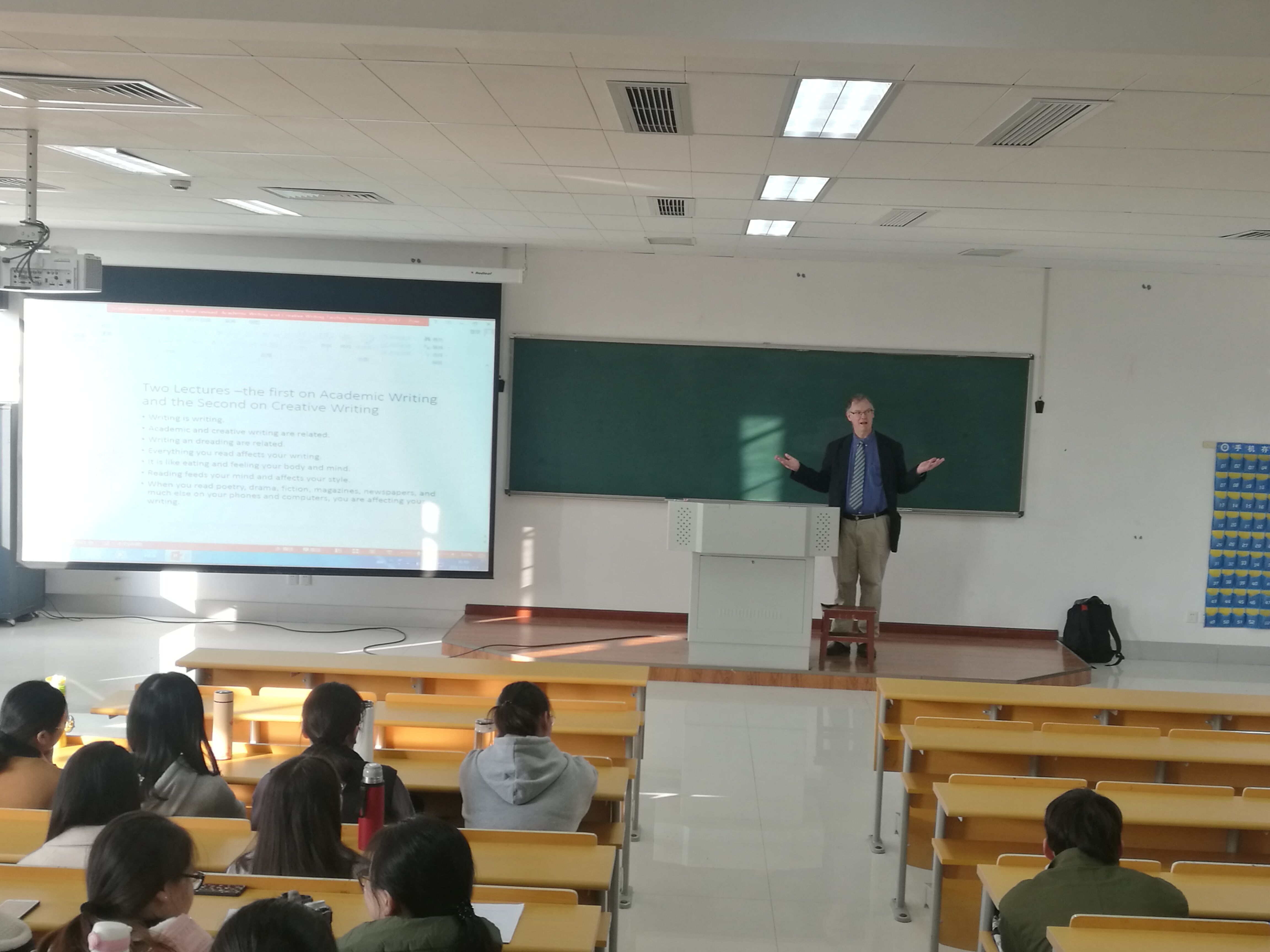 讲座过程中,Hart教授从7个部分为大家详细讲解了写作的用处、方法、影响等,并列举了中文古诗英译的例子,阐述练习翻译也可以了解汉语和英语写作风格的异同。他采取PPT的形式幽默风趣地为同学们讲解了写作的注意点以及修辞手法的运用等问题,同时热情解答了同学们关于英文写作的种种问题。