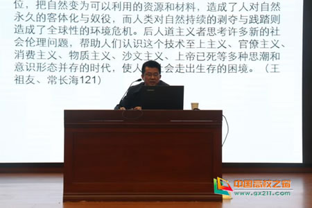 讲座中,王祖友教授首先综述了人道主义的定义和发展,在此基础上指出西方传统人道主义存在的问题和局限,提出后人道主义对人道主义的反思。后人道主义是一种发轫于20世纪前半期、以批判和反思西方传统人道主义为主旨的后现代社会文化哲学思潮。它既是一种时代的产物,也是西方文化传统对自身的一次深刻反省。接着,王教授从思维模式、文化观念、伦理价值等三个方面具体阐述了后现代社会下后人道主义对人道主义的批判、扬弃与超越。王教授指出,通过后现代主义的思维方式,后人道主义的思想定位在既不能把人等同于自然又不能认为是超自然的存在物。在人与自然关系的认识上既不能陷入“人类中心主义”立场,同时也不能步入非人类中心主义的“怪圈”,这种后人道主义的“中道”性深刻反映出后现代精神中的有机主义思想,同时,也成为西方社会思潮从人道主义向后人道主义嬗变的最终结果。