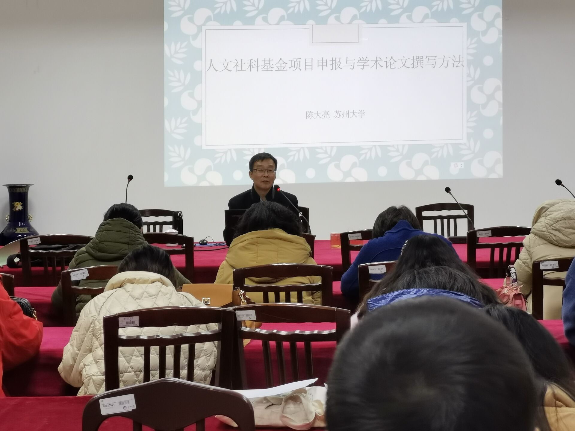 12月11日下午,苏州大学陈大亮教授莅临公司,为全体教师带来了一场题为“人文社科基金项目申报与论文撰写方法”的精彩学术讲座。讲座由副经理李更春主持。