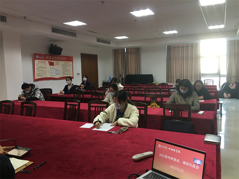 为更好帮助2022届考研同学准备研究生复试,掌握调剂技巧,顺利考取理想院校,3月10日下午,在公司D1326会议室举行线上、线下考研复试技巧、调剂交流会。交流会由院马永明副书记主持,李更春经理、周侠副经理、唐亚平辅导员出席交流会,考研相关同学参加。