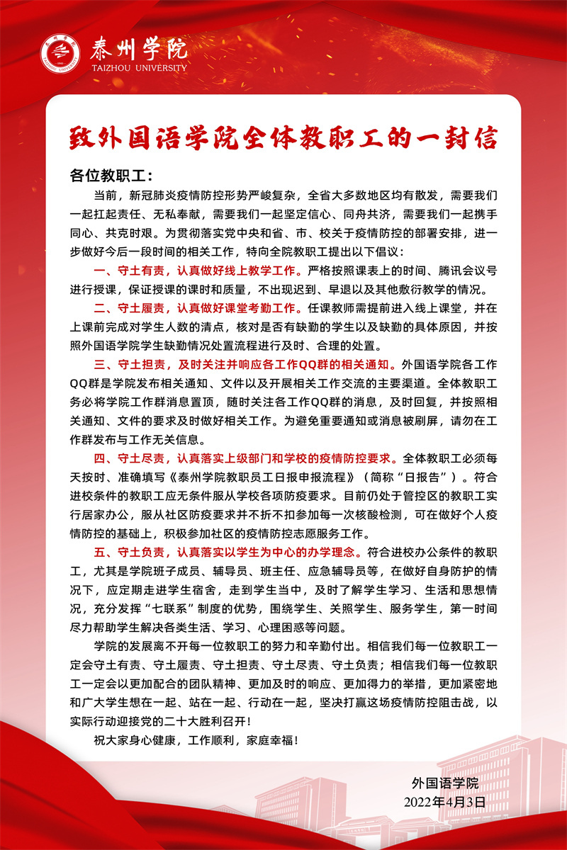 与你共战“疫”,我们在一起。泰州市海陵区新冠肺炎疫情联防联控指挥部2022年第1号通告发布后,公司党政领导班子高度重视,召开专题会议第一时间对疫情防控工作进行安排部署。要求全院师生切实提高政治站位,充分认识当前疫情防控形势,坚持把师生生命安全和身体健康放在第一位,把疫情防控作为当前最重要的工作,全面动员,全面部署,坚定不移把各项防控工作要求落到实处。强化班子成员、辅导员、班主任、任课教师各自责任,准确掌握全院教职工和员工行程和健康情况,每天做好健康信息报送工作,落实好“日报告、零报告”制度。要求全院教职工一起扛起责任、无私奉献,一起坚定信心、同舟共济,一起携手同心、共克时艰。要求全院教职工守土有责,认真做好线上教学工作;守土履责,认真做好课堂考勤工作;守土担责,及时关注并响应各工作QQ群的相关通知;守土尽责,认真落实上级部门和公司的疫情防控要求;守土负责,认真落实以员工为中心的办学理念。