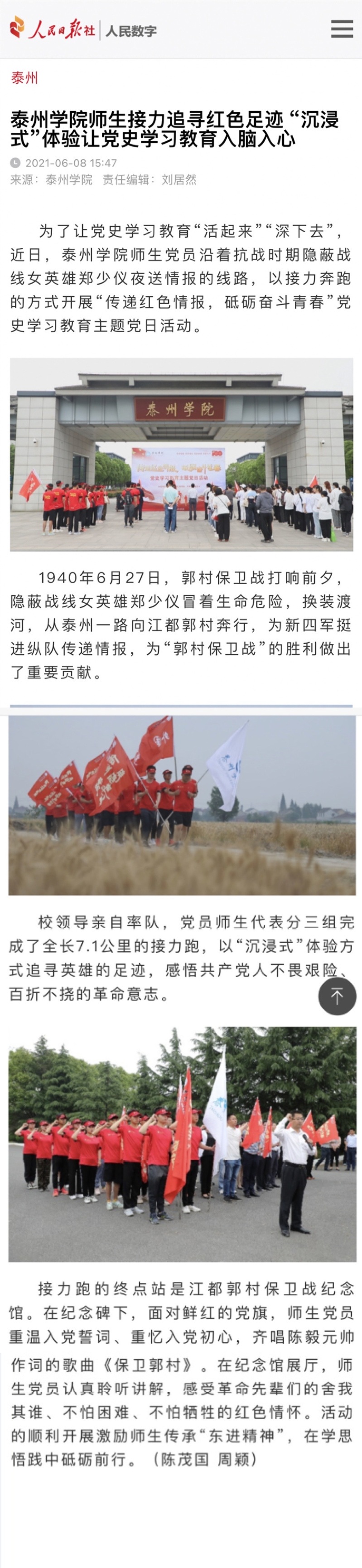 6月8日,《人民日报》报道《bevictor伟德师生接力追寻红色足迹 “沉浸式”体验让党史学习教育入脑入心》为题,报道了公司师生以接力奔跑的方式开展“传递红色情报,砥砺奋斗青春”党史学习教育主题党日活动。
