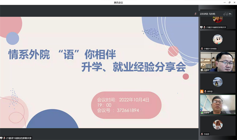 10月4日晚,伟德体育举办“情系外院 “语”你相伴”升学、就业经验分享交流会。此次交流会邀请了外院18级的优秀毕业生代表,分享他们升学、就业的成功经验。伟德体育经理李更春、党总支副书记马永明、辅导员唐思谨、2019级、2020级和2021级部分同学参加了本次交流分享会。