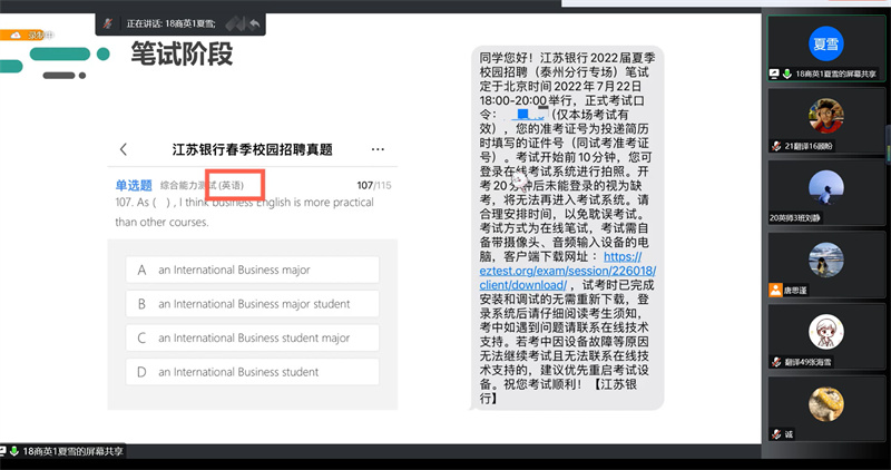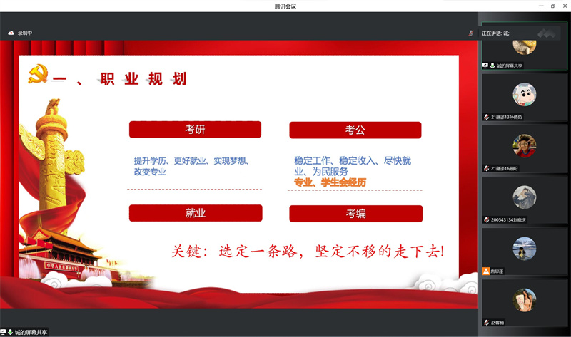 交流分享会一开始,李更春经理从考研规划和就业准备两方面给同学们提供了几点建议,马永明书记围绕生活和心理调整,关心同学们的备考和招聘情况。接下来,王欣颖、赵馨楠同学结合自己考研成功的经验,从考研准备和心理调节给大家指明方向;陆奚诚同学围绕公务员的备考经验,提出考公备考时基础和刷题尤为重要;夏雪、朱鹏程同学围绕银行求职,分享了网申、笔试和面试阶段的经验。学长学姐详尽的分享,让参会的同学们收货颇丰。