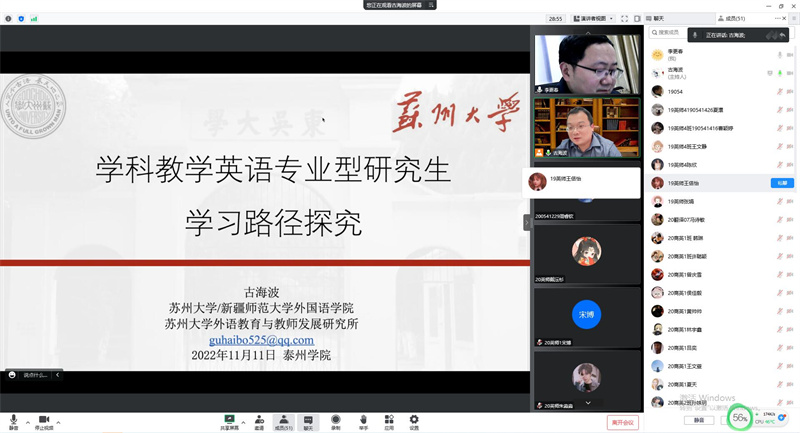11月11日,伟德体育邀请新疆师范大学伟德体育副经理(挂职)、苏州大学伟德体育副教授古海波博士,为公司19级考研员工和20级有考研意向员工带来了一场题为《学科教学英语专业型研究生学习路径探究》的指导讲座。讲座由李更春主持,公司部分领导、老师、员工以及兄弟院系师生共60余人参加了讲座。