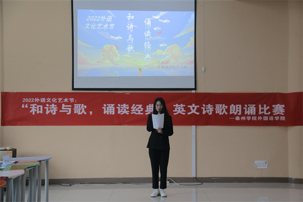 此次活动,每位参赛选手选取一首经典英文诗歌现场朗诵,并用英文进行赏析。参赛同学选取的主题十分广泛,有回望名人、赏析电影、品读诗歌等。活动中大家互述己见,思想灵魂互相碰撞,激发了同学们的创新思维,为此次2022外语文化艺术节增添了一抹缤纷的色彩。