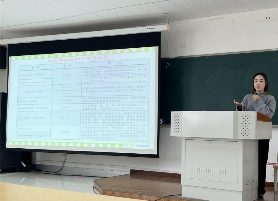 季蕾首先对译林版初中英语教材编写框架以及各种课型进行了分析,然后结合具体课例,从单元教学中的七种不同课型的讲授要领入手,细致讲解了设计不同课型教学内容时的注意要点及详细的操作步骤。季蕾曾在江苏省青年教师教学基本功大赛中多次取得佳绩,讲座中她也分享了个人丰富的参赛经验,为英语师范专业毕业生参加考编和入职后从教提供了有益的借鉴。