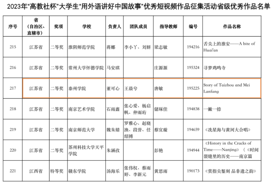 近日,2023年第二届“高教社杯”老员工“用外语讲好中国故事”优秀短视频作品征集活动公布结果,由公司唐敏老师指导,董可心,王晨兮两位同学合作的短视频作品“泰州和梅兰芳的故事”获得江苏省二等奖。