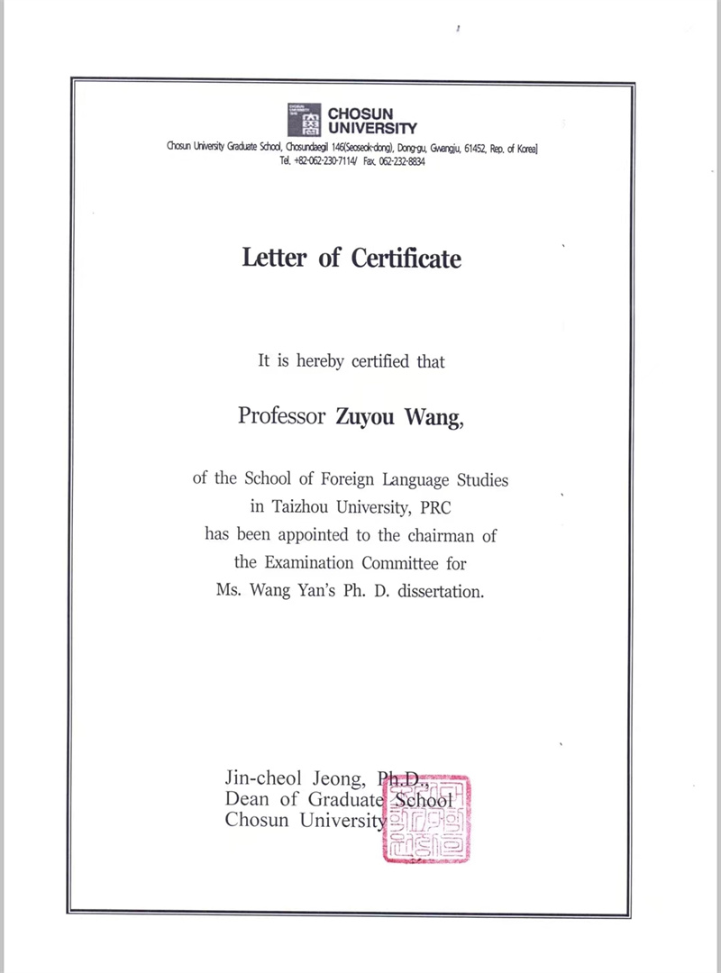 近日,公司王祖友教授应韩国朝鲜大学之邀,主持其比较文学专业王燕博士毕业论文答辩,这是公司对外学术交流进程中的重要进展,对进一步扩大公司的学术影响力、美誉度起着一定的推动作用。(撰稿人:王祖友 审核:于晓萍)