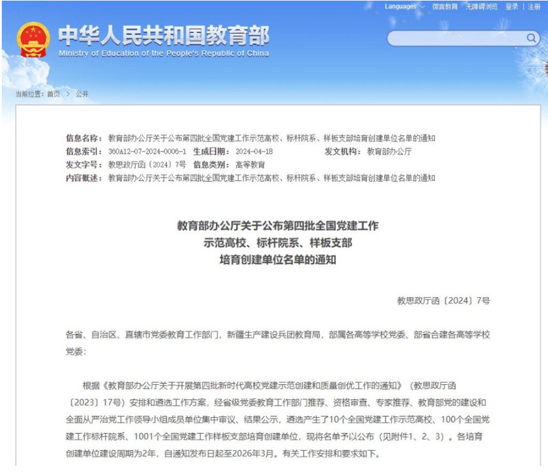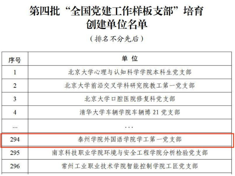 据悉,此次评选经江苏省委教育工委推荐、资格审查、专家推荐、教育部党的建设和全面从严治党工作领导小组成员单位集中审议、结果公示,遴选产生了10个全国党建工作示范高校、100个全国党建工作标杆院系、1001个全国党建工作样板支部培育创建单位。