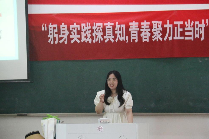 活动中,殷宁同学从社会实践的定义、分类出发向同学们介绍社会实践的意义,让同学们明白社会实践是知行合一的体现,也是用热爱和坚守点亮梦想,助力成长的信念。
