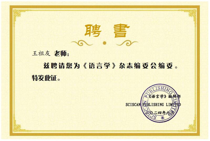近日,公司王祖友教授应邀成为华南理工大学《语言学》杂志编委,这是公司学术影响力提升的一个新表现,对扩大公司学术交流范围和水平将起到积极的推动作用。(作者:王祖友 责编:练红珍)