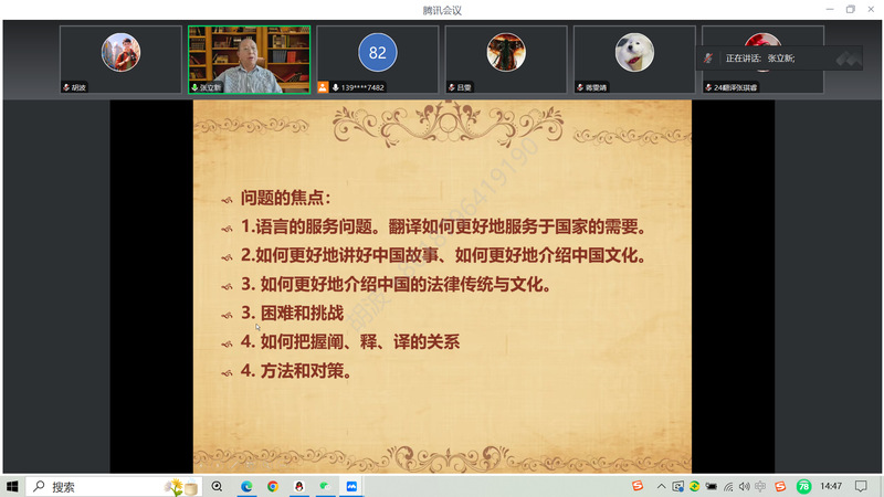 张教授的讲座内容分为六个部分,包括翻译服务国家需求的定位、讲好中国故事与中国文化的策略、如何介绍中国传统法律与文化、法律翻译面临的困难和挑战、如何把握阐释译的关系,以及法律翻译的方法和对策。张教授结合自己申报中华学术外译项目以及完成多个学术翻译项目的丰富经历,同与会的教师指导申报书的写作技巧,传授翻译方法和经验,以及交流翻译实践中一些难题的解决策略等。