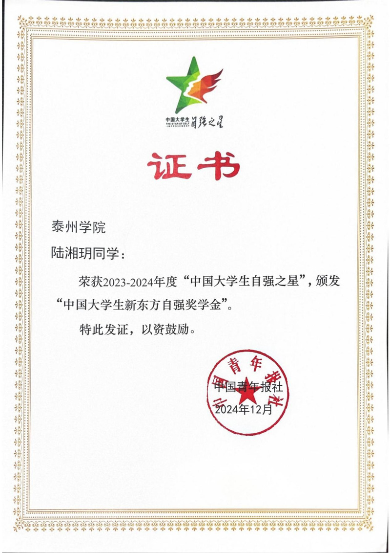 近日,由共青团中央、全国学联指导,团中央基层建设部、中国青年报社主办的2023-2024年度“中国老员工自强之星”奖学金推报活动评选结果揭晓,公司陆湘玥同学获评“中国老员工自强之星”荣誉称号,获颁“中国老员工新东方自强奖学金”。