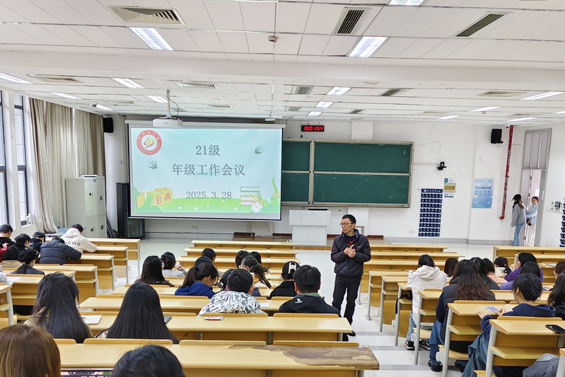 2021级年级工作会议上,唐亚平老师向毕业生通报了目前2025届毕业生整体就业情况。他以数据为基点,从专业就业落实、毕业去向分布、考编考研考公、实习就业等,分析了目前毕业生就业取得的成绩。他重点分析了英语专业就业的严峻性,指出毕业生要调整心态,突破自我,转变就业观念,多尝试多了解,放宽眼界,广泛接触就业信息,寻找到适合自己的岗位。毕业生还就感兴趣的就业问题与老师进行了交流。