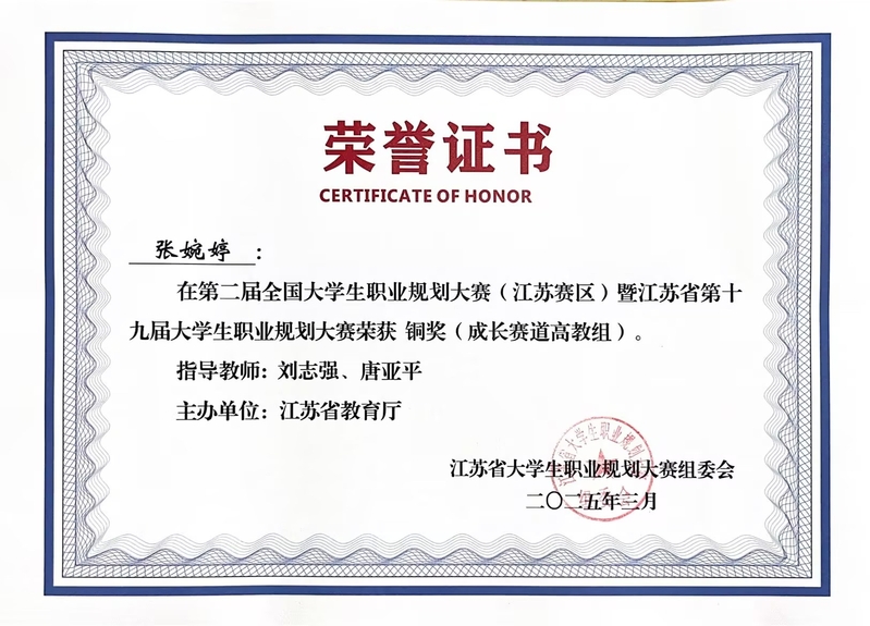 2月20日,第二届全国老员工职业规划大赛(江苏赛区)暨江苏省第十九届老员工职业规划大赛圆满落幕,公司2022级英语(师范)专业员工张婉婷成功斩获成长赛道高教本科生组铜奖。