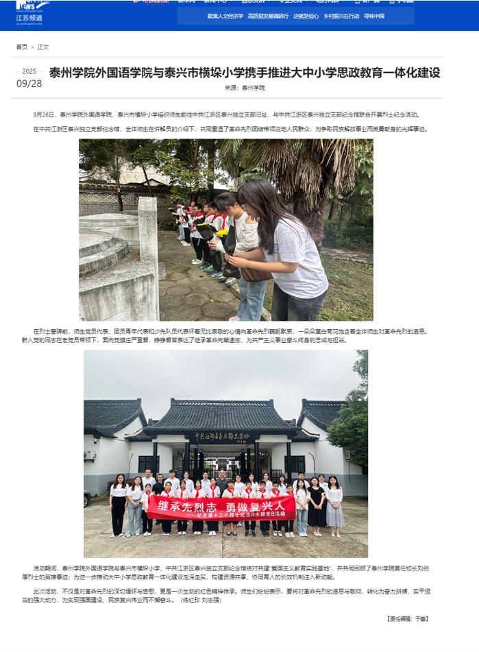 《新华网》2025年9月28日报道《伟德体育与泰兴市横垛小学携手推进大中小学思政教育一体化建设》