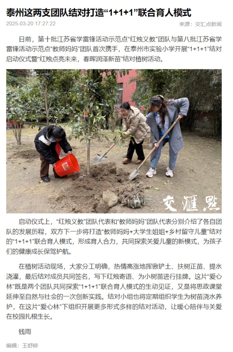 《交汇点新闻》2025年3月20日报道《泰州这两支团队结对打造“1+1+1”联合育人模式》