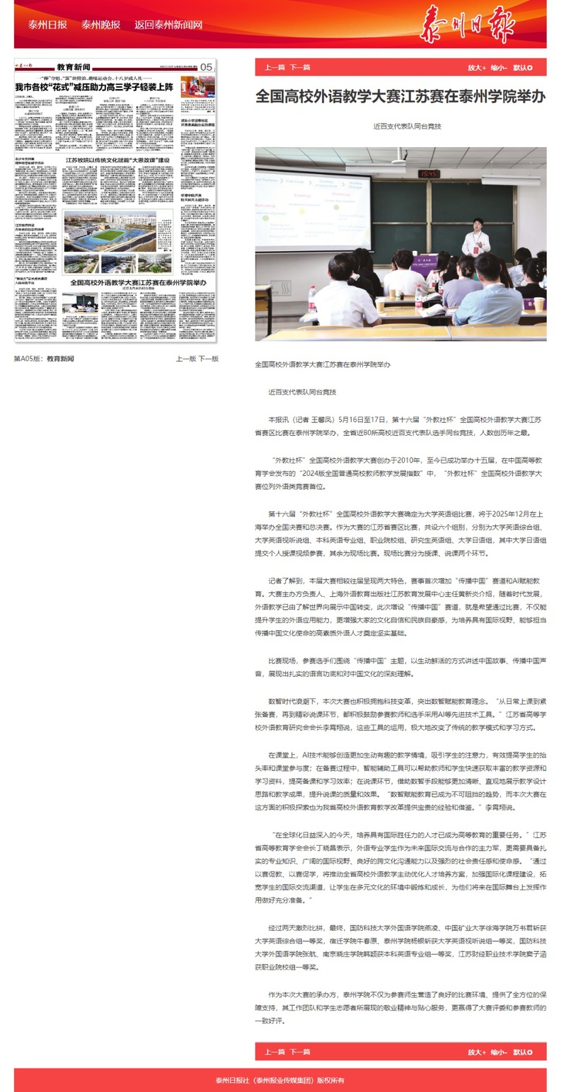 《泰州日报》2025年5月21日报道《全国高校外语教学大赛江苏赛在bevictor伟德举办》